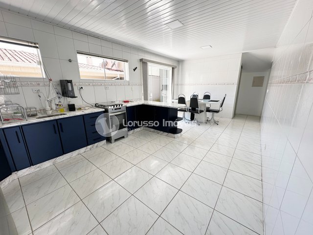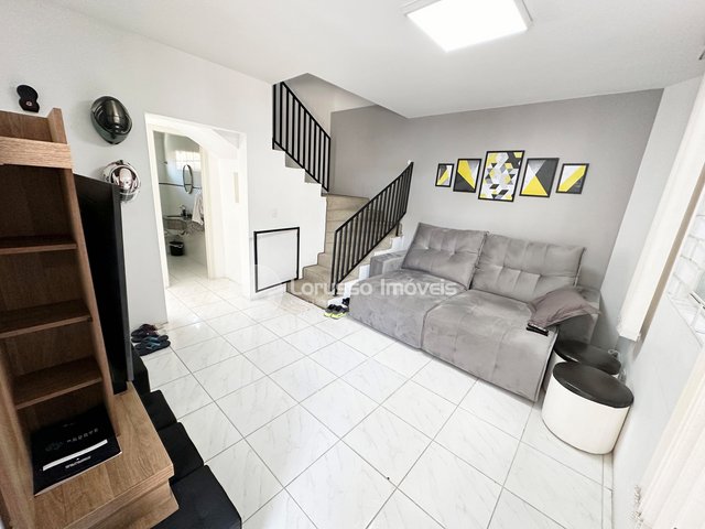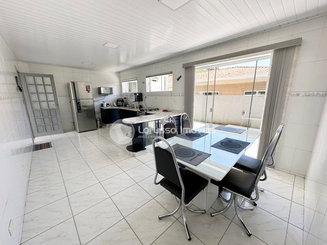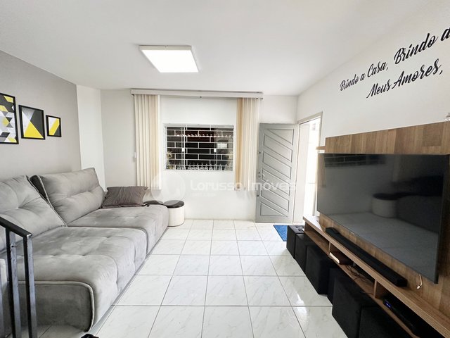 A distribuição cuidadosa dos espaços revela uma sala de TV, uma cozinha ampla com armários e área de jantar integrada, formando o coração acolhedor da casa.