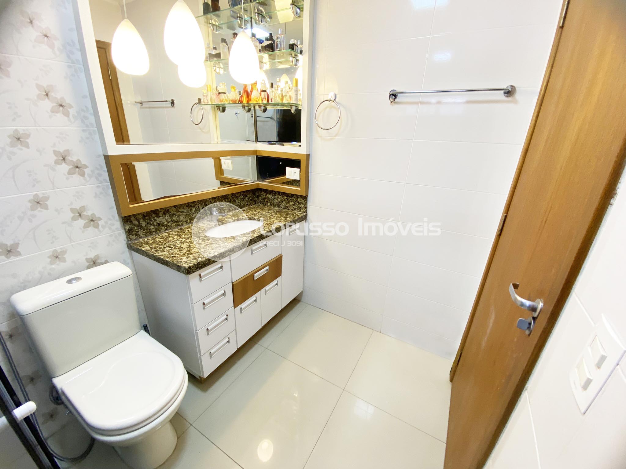 - Lavabo em porcelanato, revestido em papel de parede, iluminação embutida planejada, vaso sanitário com caixa acoplada e bancada sob medida com cuba;