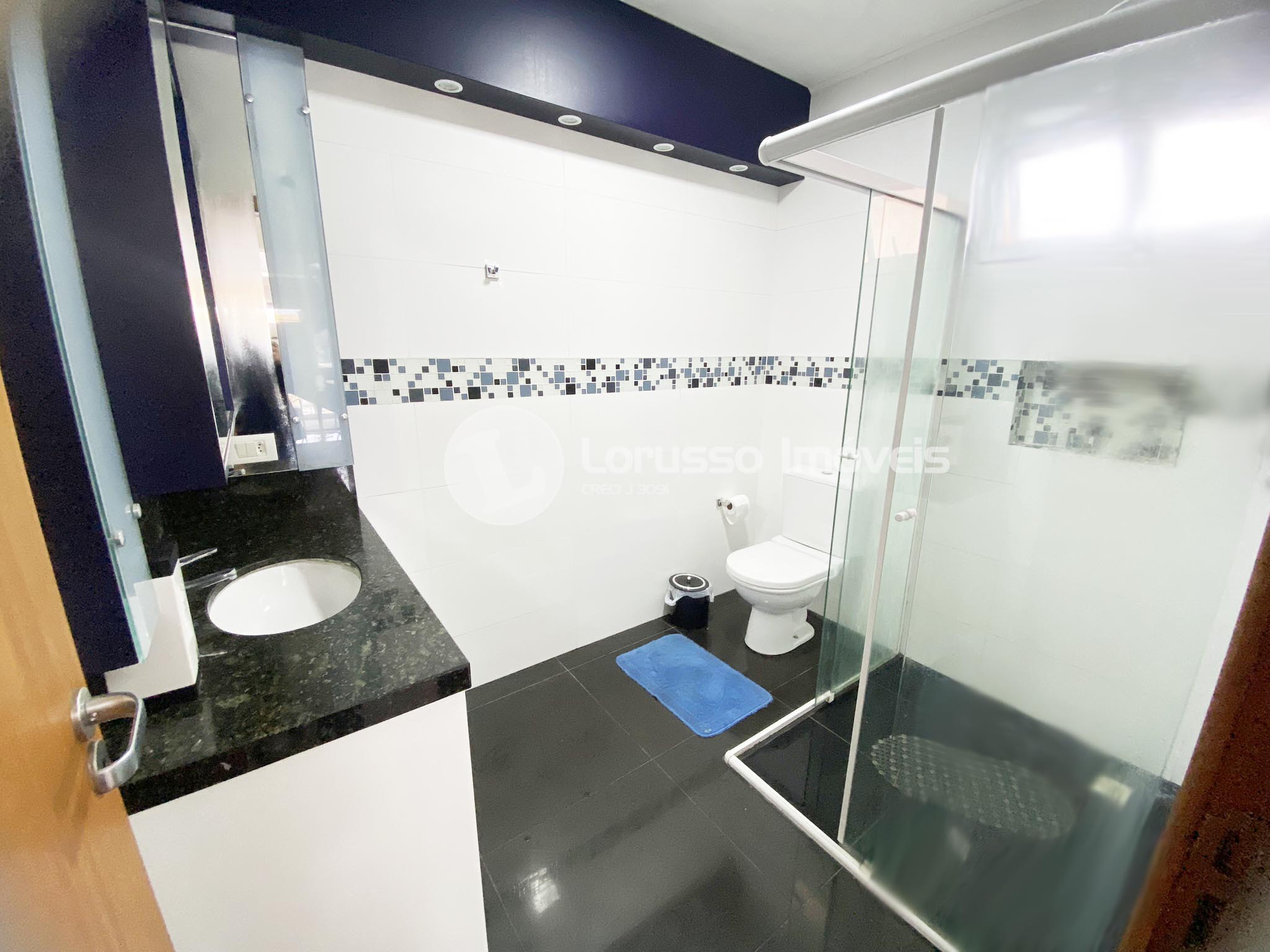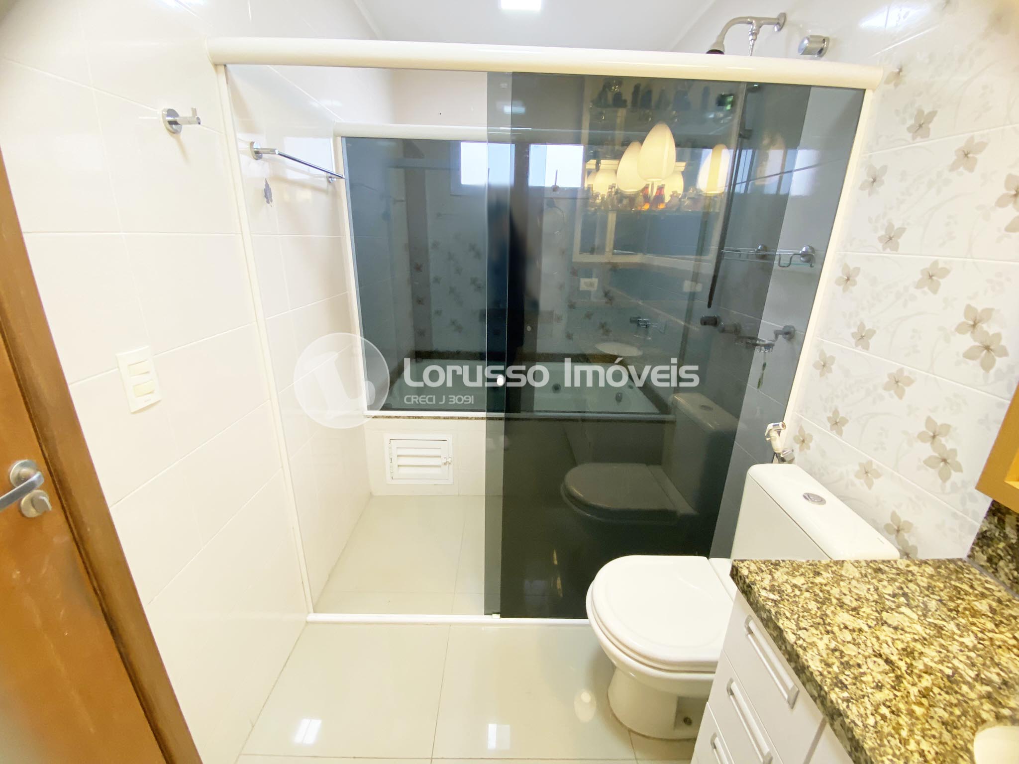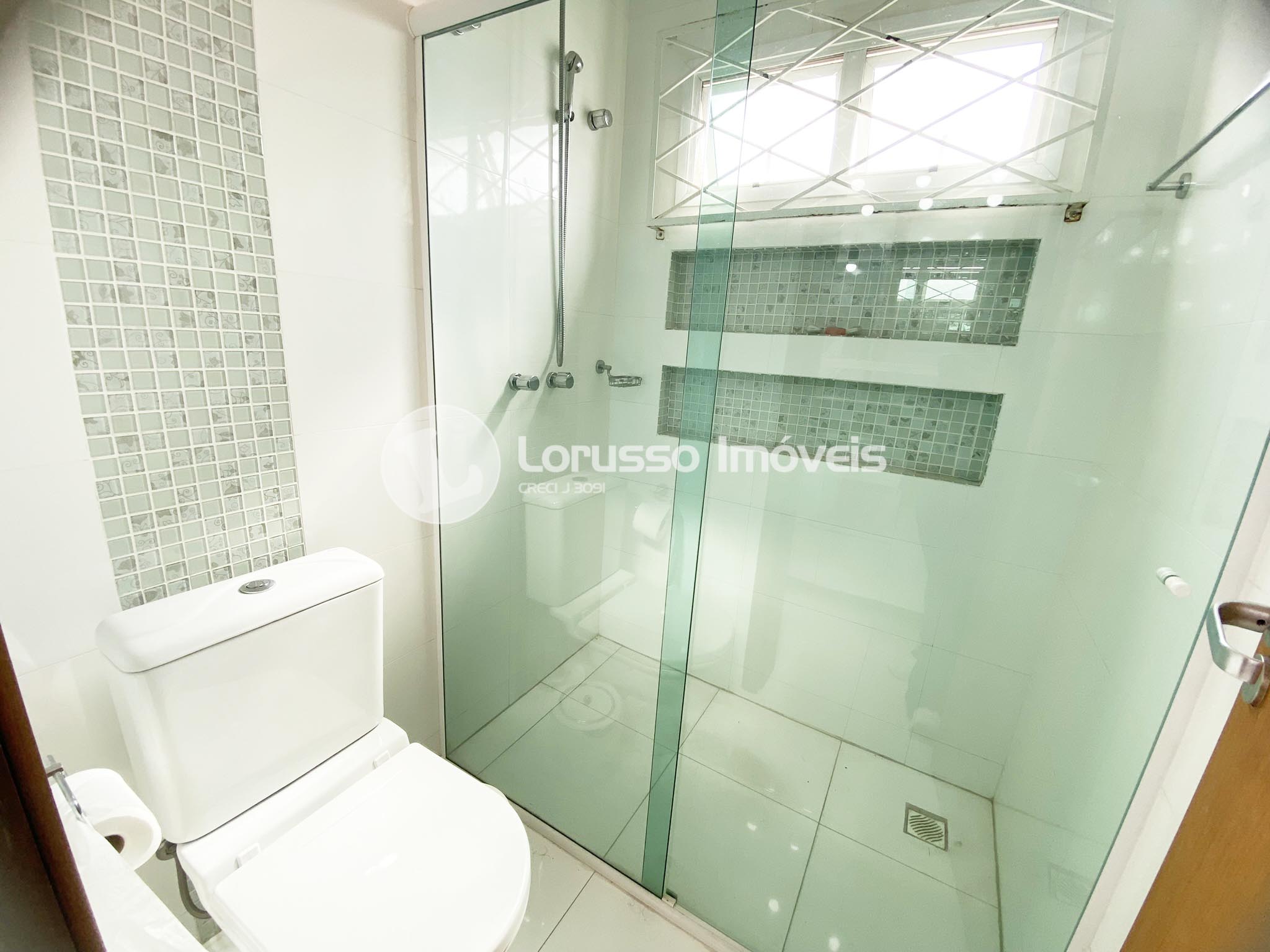 - Bwc social com armários sb medida e iluminação embutida, box de vidro