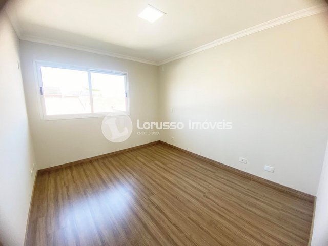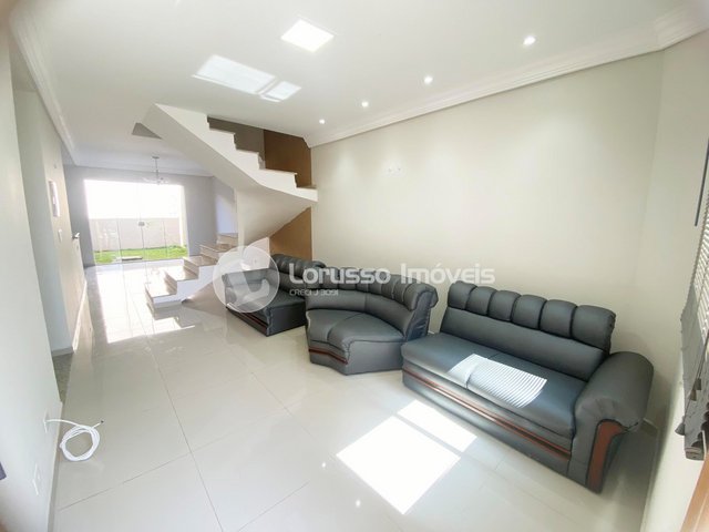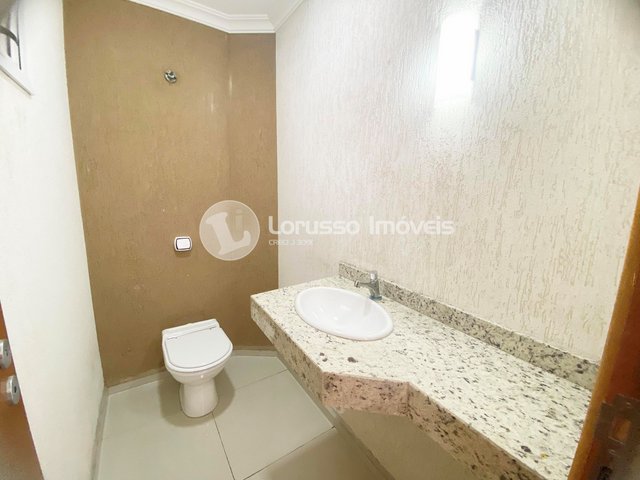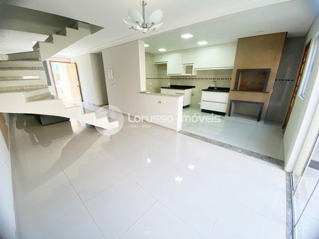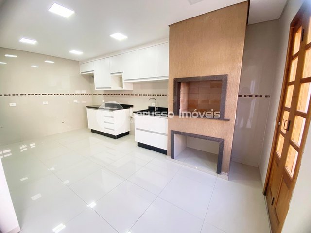 No pavimento térreo, conta com sala de estar ampla, lavabo, sala de jantar integrada ao quintal e cozinha com armários planejados e churrasqueira.